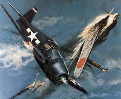 This painting, well known to WWII veterans, shows a Hellcat in action, destroying a Japanese "Zero."  Although we are only looking at a painting, "Uncle Tom" could well have seen such action; and the painting represents, for me, Tom's valor as later documented by his squadron mates.