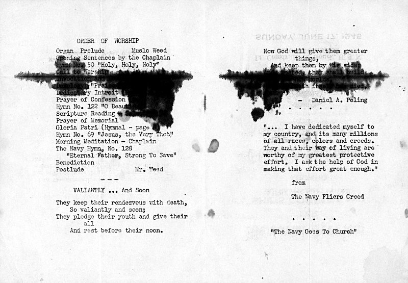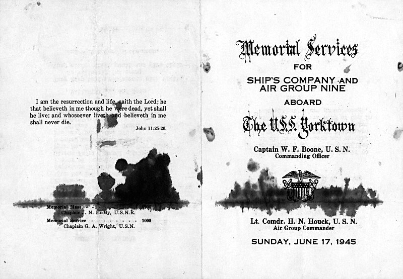 The two photos below are photos of the "program" printed and distributed aboard the Yorktown on the occasion of the memorial service held June 17, 1945.  Tom's body was never recovered; so we can assume that this service would have been (in the eyes of the Navy) Tom's funeral.  The biblical texts chosen by the ship's chaplains are certainly moving .