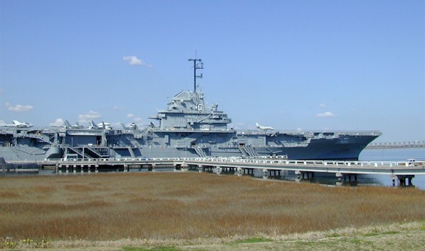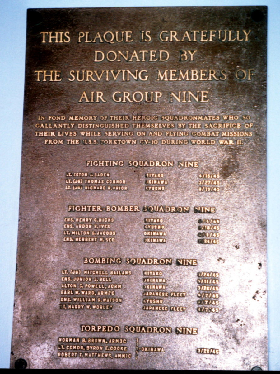 The Yorktown's final "port" in Charleston SC is shown on the postcard above.  As of 2001, she is all "decked out" for visitors and tourists.  The principal attraction for thousands are replicas of the Hellcat and other planes who flew from her decks.  For many hundreds of Americans, however, the principal attraction is the memorial plaques honoring those who died.  Tom's placque is shown below.