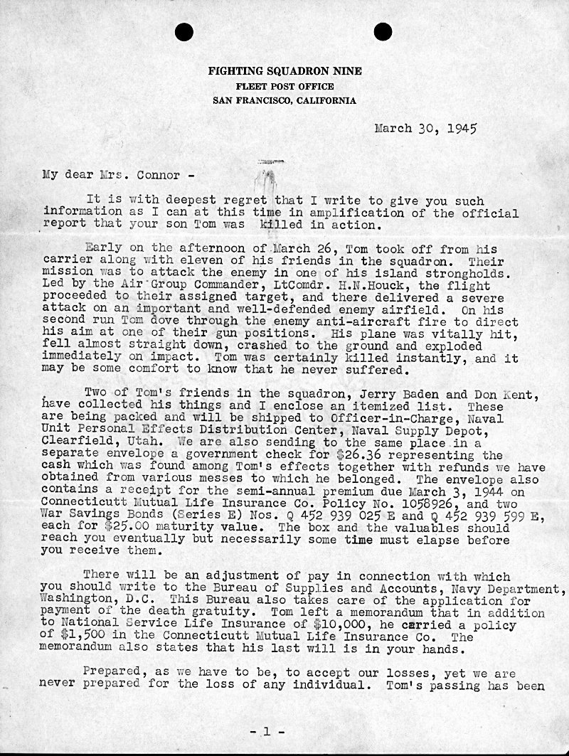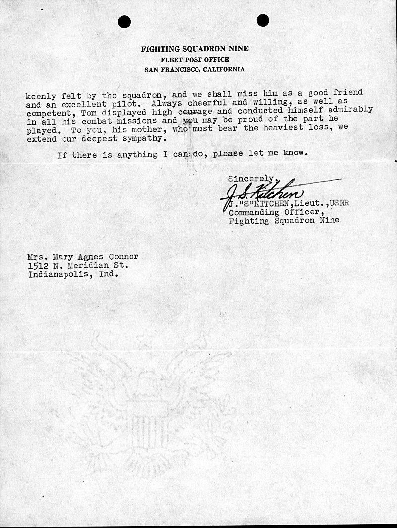 The letter below was written to Tom's mother, Mary Agnes Egan Connor, by Tom's commanding officer.  "Gram" Connor was already five years a widow by this time and had three other sons on active military duty.  When reading the letter, note that Jerry Baden and Don Kent were assigned to "gather up" Tom's personal effects and help sort out whatever papers etc. were left in his quarters.  Further down this page I have displayed photos of the plaques on display on board the Yorktown at her final resting place in Charlestown South Carolina as of 2001.  We notice from the plaques that Jerry Baden was also killed in action just a few days after Tom.