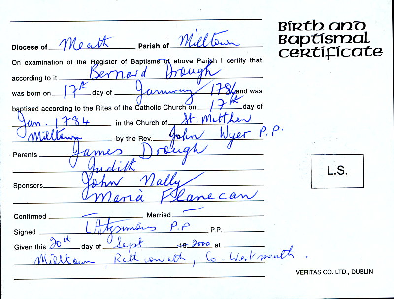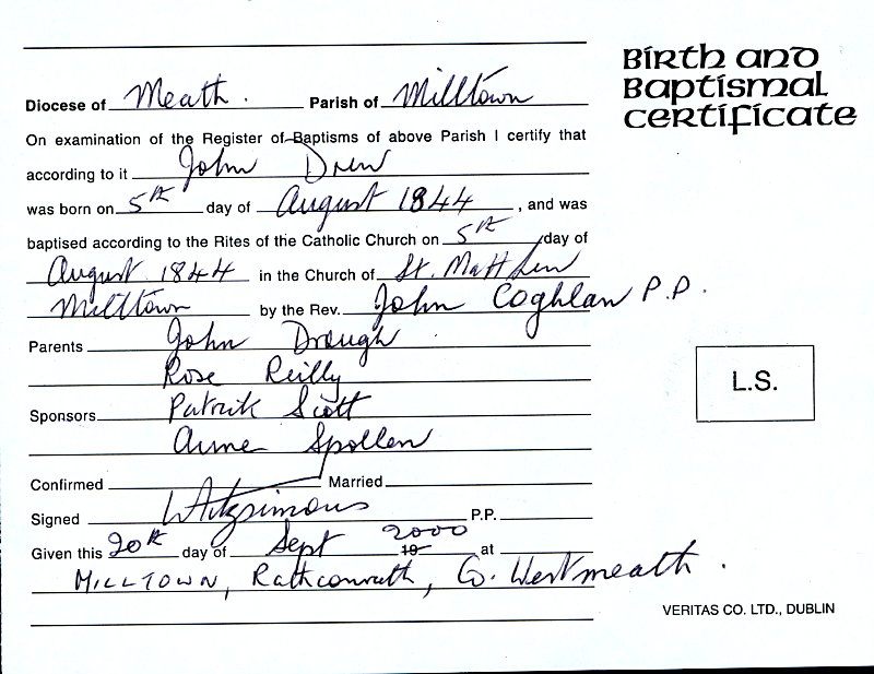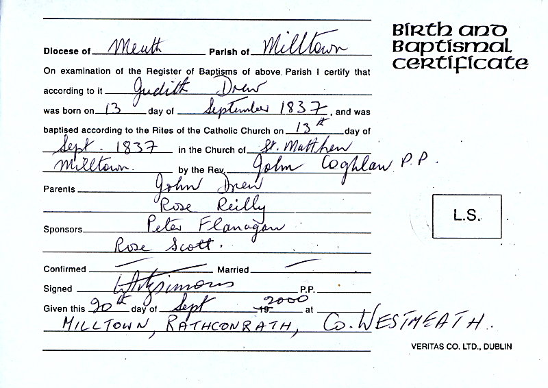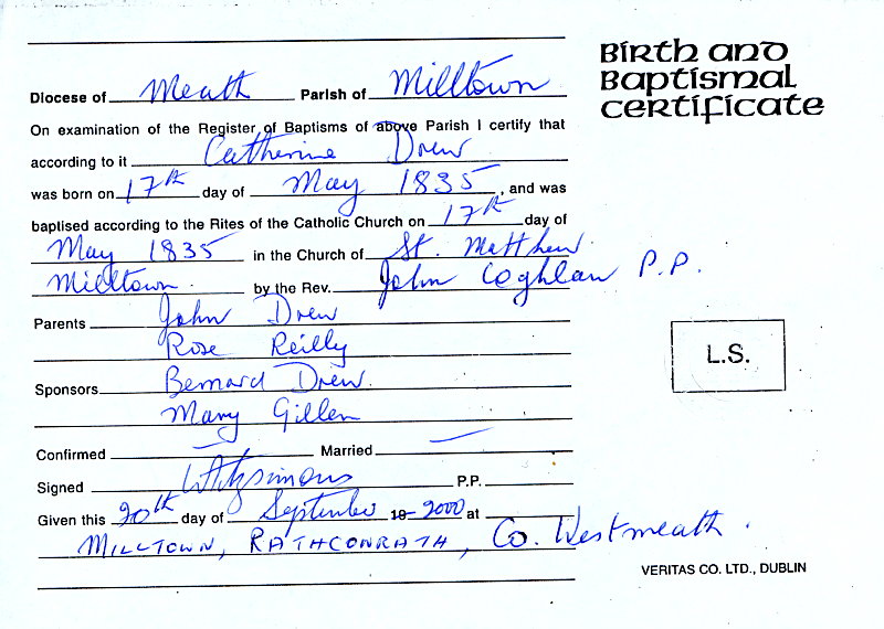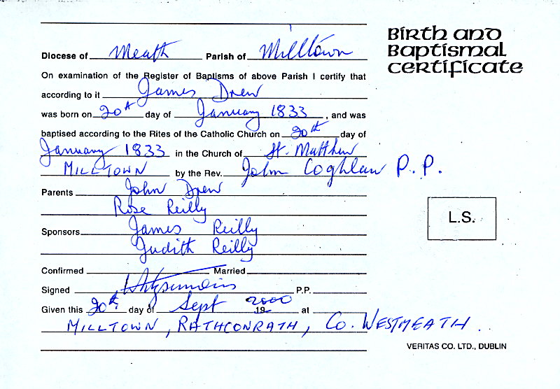 CLICK HERE or on the thumbnail at left to see John's baptism record A study of the parish's baptism records seems to indicate that John had six older sisters, but no brothers... and that he was, therefore, the "baby of the family." His older sisters were named Mary, Judith, Catherine, Bridget, Margaret, and Rose. All of these names (except for Bridget) recur frequently in John's descendants. His grandparents on the Drew side are thought to be James and Judith Drew; but the records at Milltown do not record mothers' maiden names or fathers' middle names, so it is impossible to trace his grandparents with certainty. Nonetheless, there is enough certainty to render us bold enough to keep Bernard Drew's 1784 birth certificate as an heirloom.