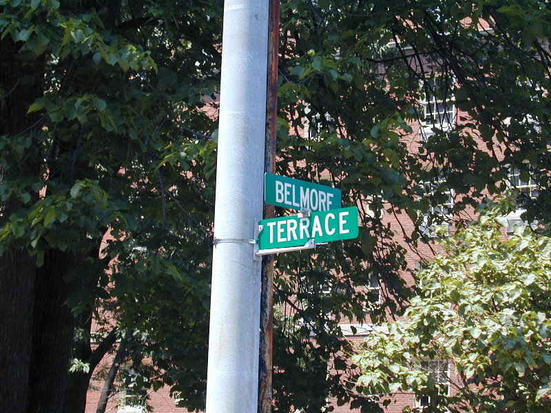 Looking north down Belmore, one sees several homes and appartments that look similar to the background in the 1921 photo.  Aunt Louise, who lived there only as a little girl, believes the house was just a few houses from Euclid Avenue... which would place it down near the "tower" in the distance.  The homes down there, however, have been razed to make room for a parking lot; and thus it is possible that the old Drew home is no longer standing.