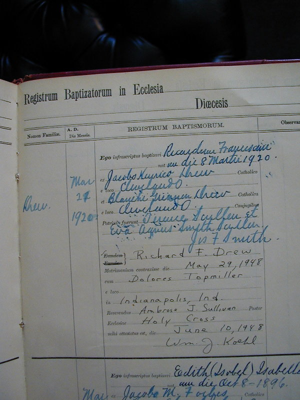This photo from 2001 shows John M. Drew holding the very old and very venerable baptism and marriage registry of St. Philomena's church.  He poses here with the Pastor, Fr. Kleinweber prior to searching the records for Drew family entries.  As expected according to tradition and research, the only record found was the baptism of Richard Francis Drew, the youngest child of James H. and Blanche Drew.  The six older children were all born and baptized in Indianapolis prior to the family moving to Cleveland in 1919.