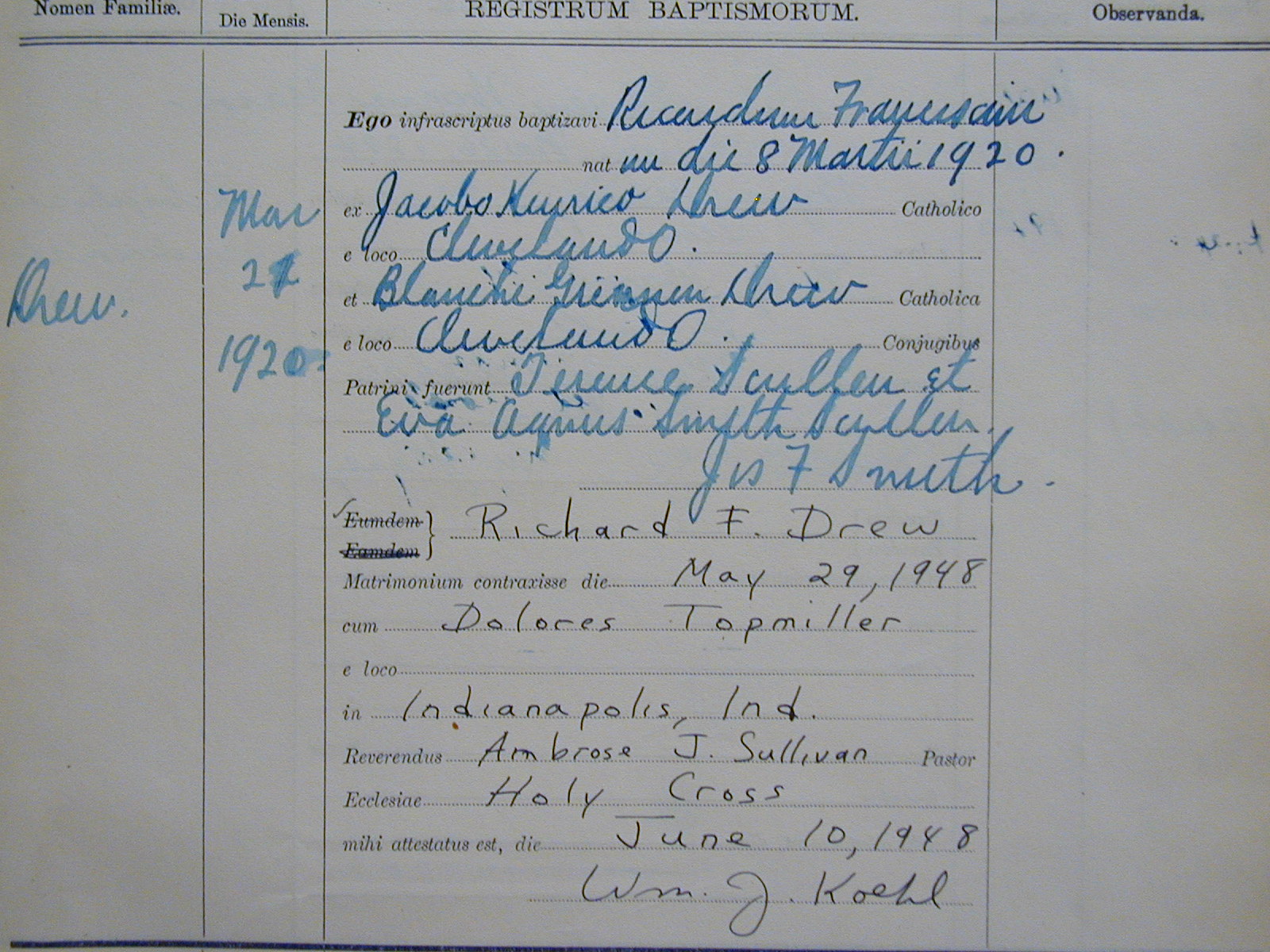 Above is a photo of the priest's entry of Richard F. Drew's baptism on March 27, 1920... giving also his date of birth, March 8, 1920.  The sponsors (Godparents) are listed as Terrence Scullen and Eva Agnes Smith Scullen.  The priest who signed the entry was Jas (James) OR Jos (Joseph) Smith.  Note that in 1948, information regarding Richard F. Drew's marriage in Indianapolis to Delores Topmiller was exchanged between the two pastors and was recorded in the registry at St. Philomena's.