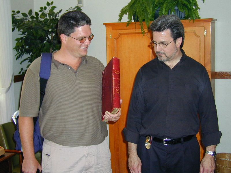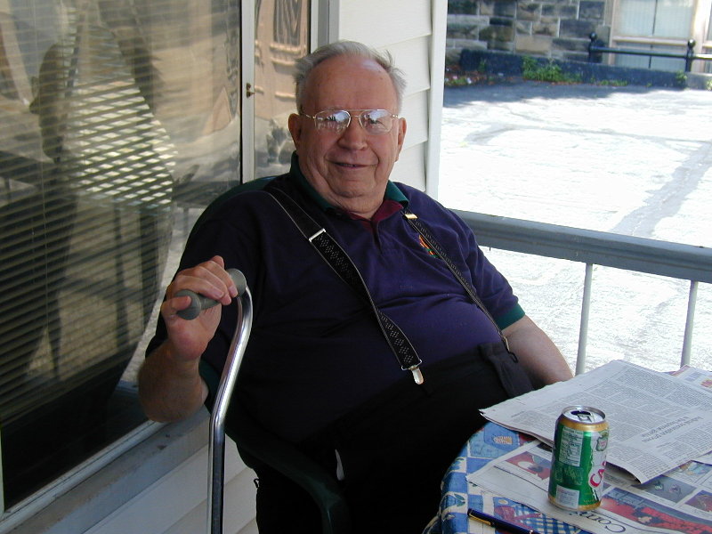 Retired St. Philomena's pastor, Fr. McCarthy, poses on the porch of the pastor's home during our 2001 visit.