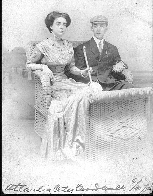 Harry and Blanche spent a very nice honeymoon at the Hotel Dennis in Atlantic City, NJ.  The above photo was taken during that time on the famous "boardwalk" where they obviously posed for this official picture.  The two postcards below were sent to them during their stay in Atlantic City.  The first is from Blanche's "mama," Katie Ryan Greenen; and the second is a "double entry" message by her brother Charlie, his wife "Millie" Dewenter Greenen.  They should be self explanatory... especially if you can remember that Katie (our great grandmother DOES NOT CROSS t's... and dot's i's only when in the mood... and a wonderful woman in spite of these habits.