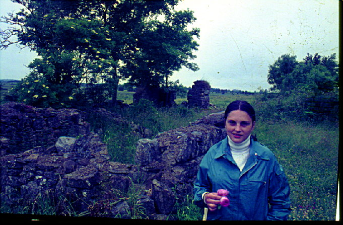 Marilyn Drew poses amidst the old stone foundations in 1971. In her hand is a sample of the beautiful roses that grow up wild among the ruins.