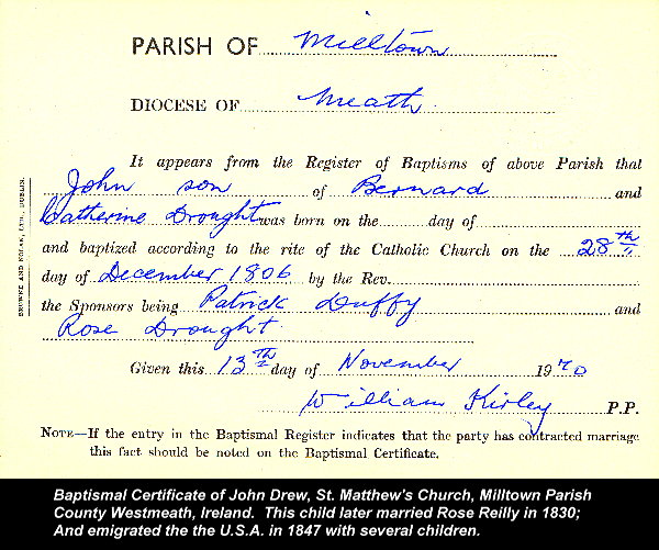 The 1970 picture above shows Daniel C. Drew looking over the shoulder of professional Genalogist and researcher, Berkley L. Vincent of Dublin Ireland. Without his patient and competent assistance and some incredible good luck, the Drew family history could not have been traced. The two men above worked very hard for many months to seek out the Drew family church records. As for the "luck" involved, very few Irish families would have the good fortune we had because records keeping was very poor in most places and many records have been destroyed by an early 1900's fire in the Dublin "Customs House" where the records were kept. Fortunately, the records of St. Matthews Church in Milltown were preserved... and when reviewed, the Drew family entries matched perfectly with the records in the old Drew and McGee family Bibles found in the U.S.