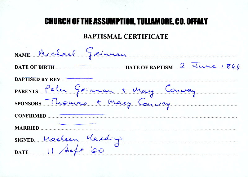 CHILDREN BORN IN IRELAND After some hard work and careful research, it was our good fortune to locate the ancestral Catholic parish of the Greenen family (St. Columba's) and to study the church registry of marriages and baptisms. The discovery of these records allowed us to clarify, and verify what had been a very uncertain (and sometimes conflicting) set of traditions regarding the marriage and children of Peter Greenen and Mary Conway.