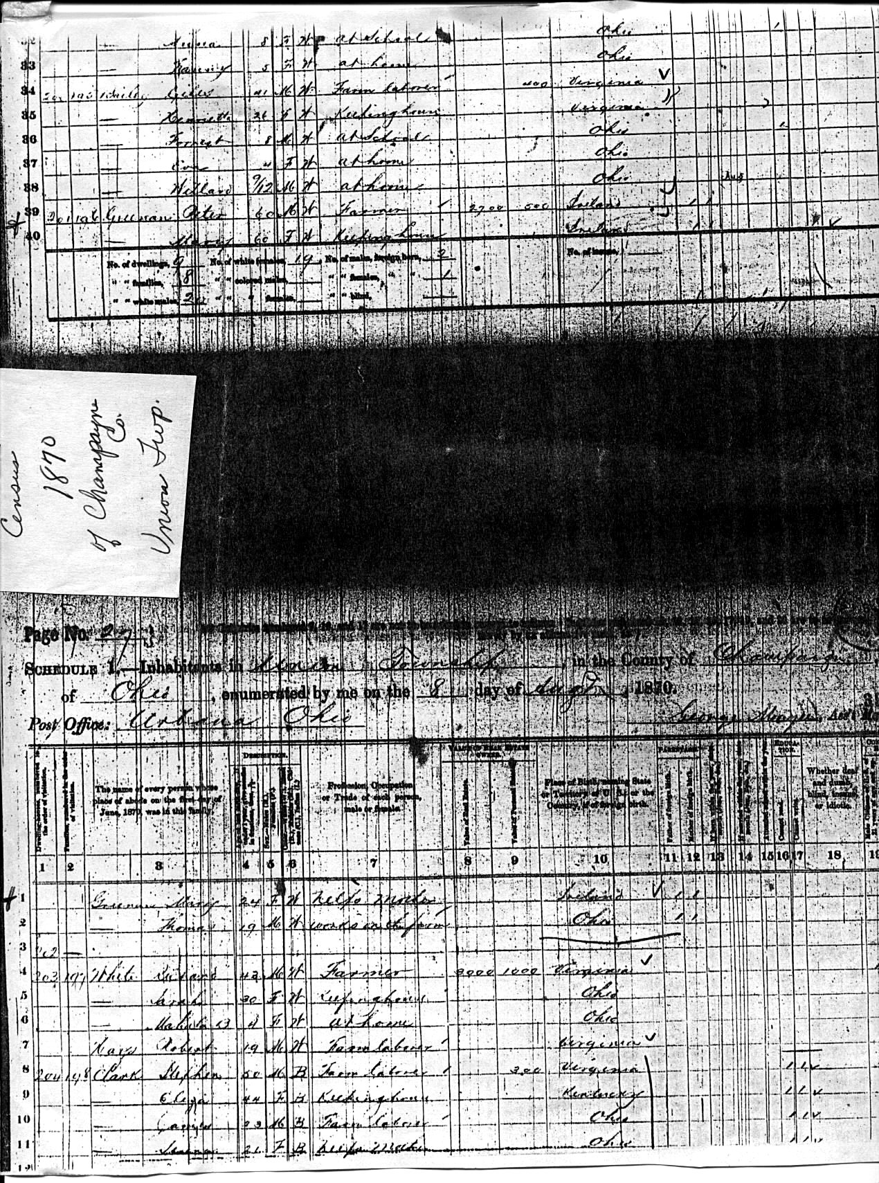[Union Township, Champaigne County, Ohio]Several of his grandchildren had "family notes" which indicated that Peter "homesteaded" a 160 (or at least 120) acre tract of land in Union Township, Champaign County Ohio, which is located west of Columbus and north of Springfield, Ohio. The county seat is Urbana; and numerous family notes and traditions speak of the family's "time in Urbana." More recent research has shown that Peter's land holdings may have been far less than 120 acres. As of 1874 Peter's holdings appear to be about 60+ acres... in two separate plots.