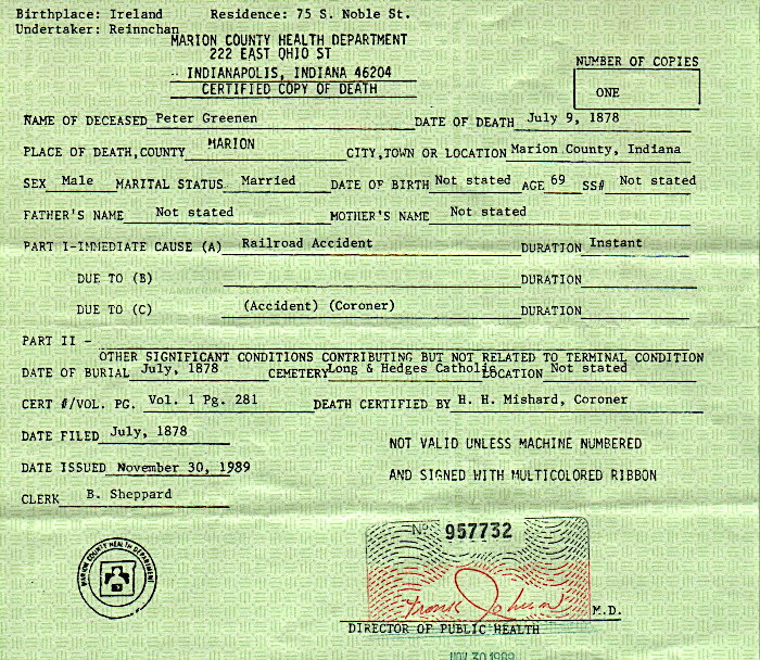 PETER GREENEN'S DEATH Peter Greenen's death occurred July 9, 1878 at age 68. He had spent a life of hard work and died in service to the railroad. Several obituary articles appeared and are posted HERE. Thanks are due to Gloria Greenen Bixler for tracking down these articles from the archives of the Indianapolis Public Library. The obituaries are (excessively?) vivid and eliminate the need to write further about his death. Besides being "a good man" and "a good Catholic" as the obituaries attest, Peter's reputation as a hard working, dutiful, loyal, and loving husband and father has been passed down through the generations. He was spoken of often and with admiration even by his grandsons and great grandsons who were known to those of us producing this history document 120 years after his death.