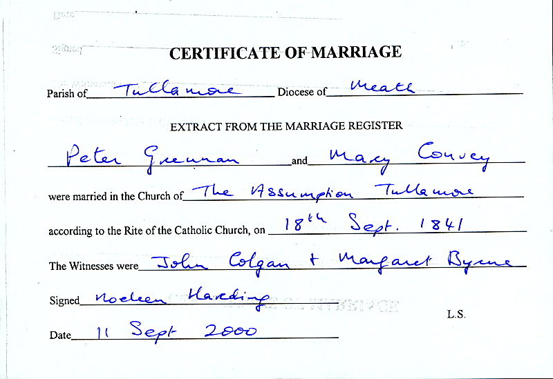 The parish registry has been found and examined and the marriage is confirmed to have occurred on Sepember 18, 1841. The witnesses were John Colgan and Margaret Byrne.