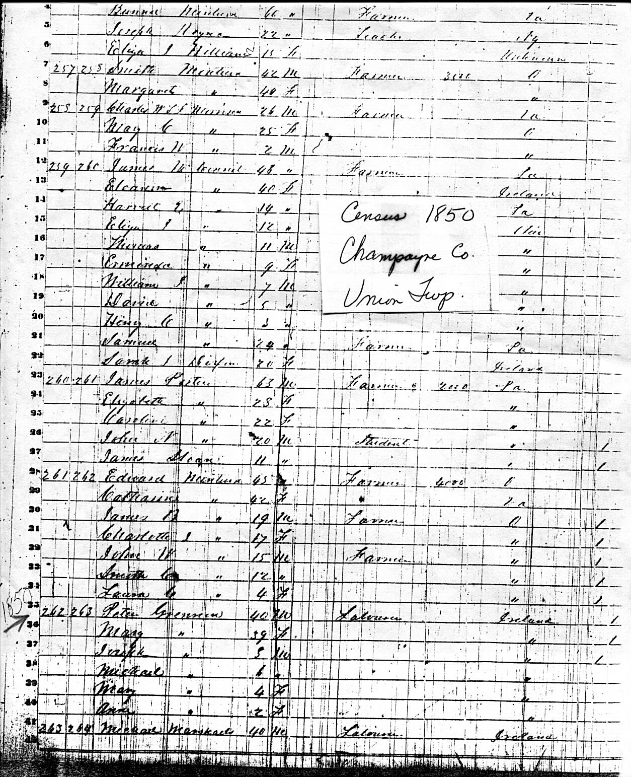 Reviewing the 1850 census provides, first and foremost, an absolutely complete confirmation of the birth dates of all the family members at that time, as calculated from other records and as entered in the baptismal records of Durrow Parish, King's County, Ireland. In addition, this 1850 Census report, tracked down and researched by Cousin Andy Sauer, locates the Peter Greenen homestead in Union Township, Champaign County, Ohio... the township just east of the city of Urbana. For historical accuracy I shall recite that the census entries for this family occur on page 306 of the Census for that County, and that the census entries were made by a Colin McDonald. The "date of enumeration" [Date on which the enumerator signed the page] was October 21, 1850. However, because J.W. Greenen (with a late November birthday) is listed as being already 8, it is possible that the actual interview with this family occurred later than October 21. As can be seen in the table above, our great grandfather, Joseph, was already attending grammar school. Michael, however, who turned six in June of that year, was still listed as "at home" ...thus indicating that age 7 was probably thought to be the age to begin schooling at that time.