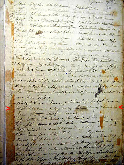 This photo shows the baptismal entry for Mary, daughter of Peter Grennan & Mary Conlin. Sponsors were Christopher Quinn and Mary Kain. The date was March 29, 1846. The spelling "Conlin" is thought to be a "slip of the pen" or lapse of memory on the part of the priest who made these entries. As can be seen, there were many many baptisms on this date; and it would be understandable that he might have "messed up" on his notes or remembered a name incorrectly. Careful review of other documents confirms that this entry would HAVE TO BE "our" Mary Greenen's baptism; and the priest really did mean to write "Conway." This entry is the ONLY occurrance of the name "Conlin" in all the records we reviewed in this parish. The Mary Greenen whose baptism is recorded here made "the trip" to America with her family and later married Patrick Graham and had many descendents.