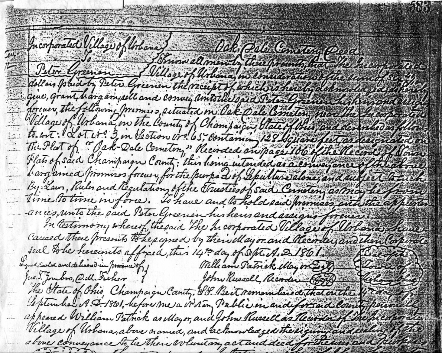 Two days later, on September 14, Peter received a deed to a plot in the Oakdale Cemetery in Urbana; obviously for the purpose of Ella's burial. A (rather poor) copy of the deed is shown below. The plot was 128 square feet which is a plot sufficient for three graves. It is defined as Lot 3 in Section 65... an area of the cemetery which came to be known as "Irish Row."