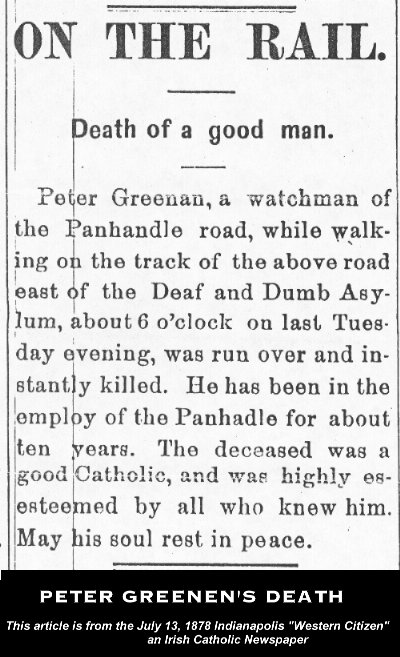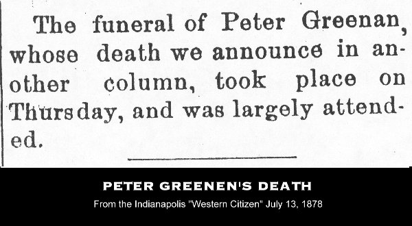 Careful research has shown that some of the information in these obituary notices is incorrect. Apparently there was a type of "news-service" in place at the time wherein a single reporter would gather information and pass it on to several newspapers; as the articles are all consistent in misspelling the Greenen name. Furthermore, careful and accurate research has revealed that Peter's age was 68 at the time of his death... NOT 60.