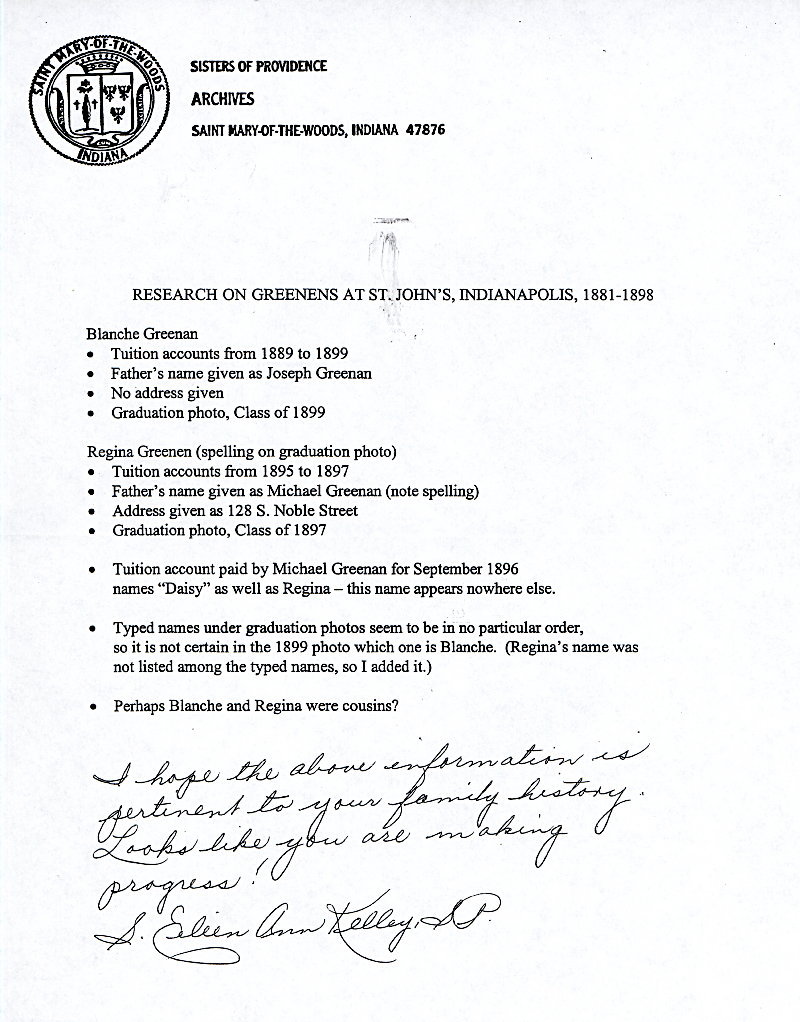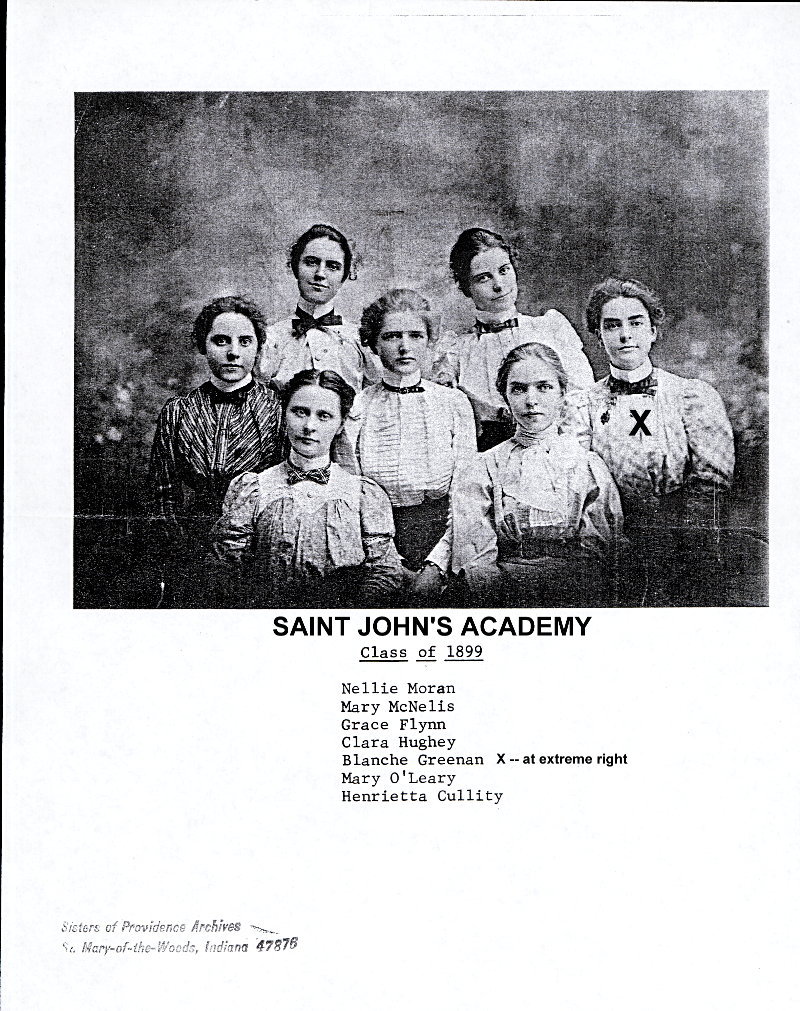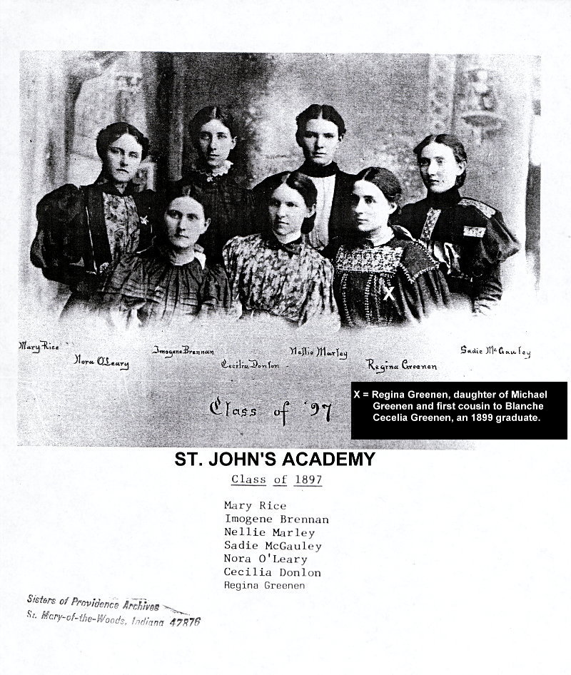 Thanks to research by Andy Sauer, referred to earlier, we can enjoy the available documentation regarding the attendance at St. John's Academy... including graduation... of both Blanche Cecelia Greenen (daughter of J.W. and "Katie") ...and her first cousin, Regina Greenen, daughter of J.W.'s brother, Michael.