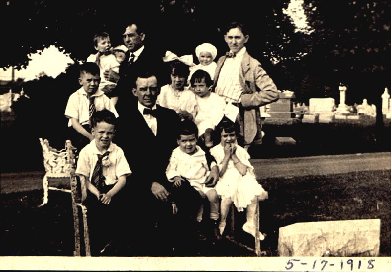 In the graveside photo at left, many of J.W.'s grandchildren are shown. J.W.'s son Thomas (still a bachelor) is seated in front with his nephew Daniel G. Drew to his right and William K. Drew to his left.  James J. Drew is seated at Thomas's right shoulder while Cecelia and Mary Louise Drew are seen over his left shoulder.  Standing in the dark suit is Joseph J. ("Joe") Greenen holding one of his children.   Standing in the light suit is James H. ("Harry") Drew holding Edward V. Drew.