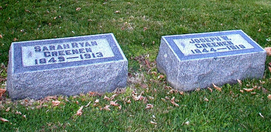 This photo from the year 2001 shows the gravesites of J.W. Greenen and his wife Sarah ("Katie") (Ryan) Greenen at Holy Cross Cemetery in Indianapolis.  [Not shown is the identical stone of "Katie's" sister Margaret Ryan who is buried to the immediate left beside her sister.]  Note that the dates of death are accurate; but that both birth years are incorrect "guesses" ...probably given to the funeral directors by a family member who did not have the correct dates at hand; but who was willing to have his best guess be memorialized.  J.W. Greenen's actual date of birth was November 29, 1842; and "Katie's" was February 29, 1848.