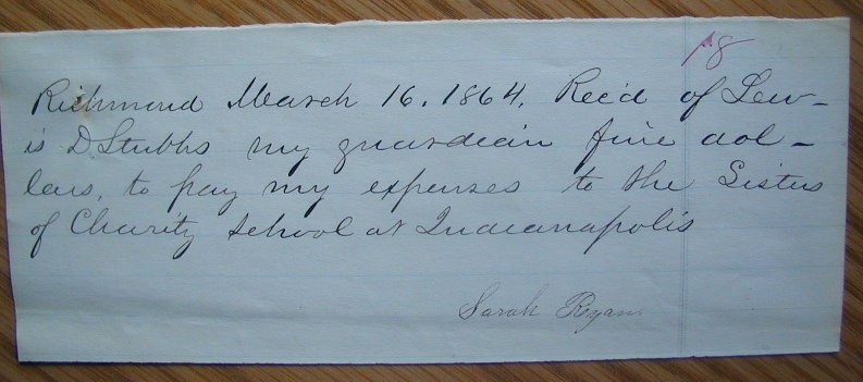 Meanwhile, the wonderful collection of receipts found in the Wayne County Courthouse by researcher Arnold Dean, clearly indicate that Sarah ("Katie") Ryan and her sister, Julia, were enrolled in the boarding School at St. John's in Indianapolis during 1864, at which time Katie would have been 16 years old. The receipts indicate payment of both tuition as well as rail transportation to and from Richmond to attend school.  Note that the receipts indicate that the school was run by the "Sisters of Charity" ...but careful research by Andy Sauer have proven that the sisters running the school were the Sisters of Providence, headquartered in Terre Haute... and that this order of nuns (as well as several others) were referred to "generically" as the "Sisters of Charity" because of their work with the sick and wounded during the civil war; and are not to be confused with the "Sisters of Charity of St. Vincent DePaul."  CLICK HERE  to see a sample of a receipt for "Katie's" schooling in Indianapolis