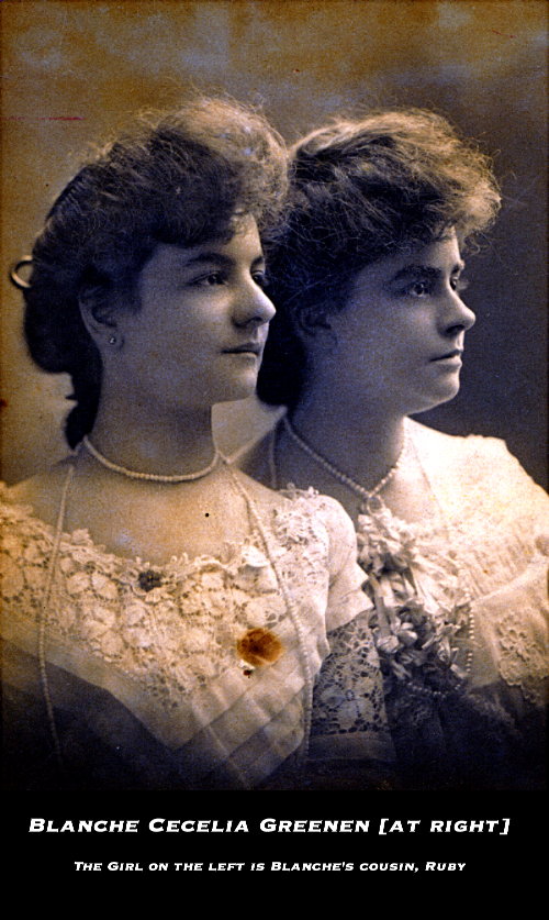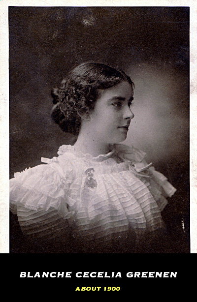 This photo shows Blanche Greenen (later Drew)  wearing some kind of medal... most likely won in the field of music.  I believe the date I wrote in the caption is WRONG!  Most likely Blanche is only about 15 or 16 here... which would date this photo in 1895 or '96.  Note that the dress is NOT the same as in the photo below... but I suspect the two photos represent an "annual" event at which Blanche was honored with a medal.