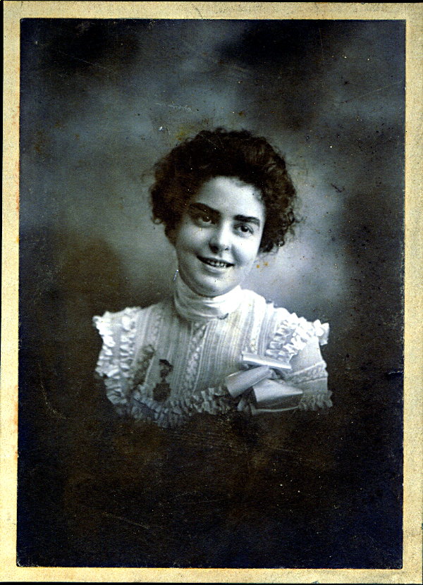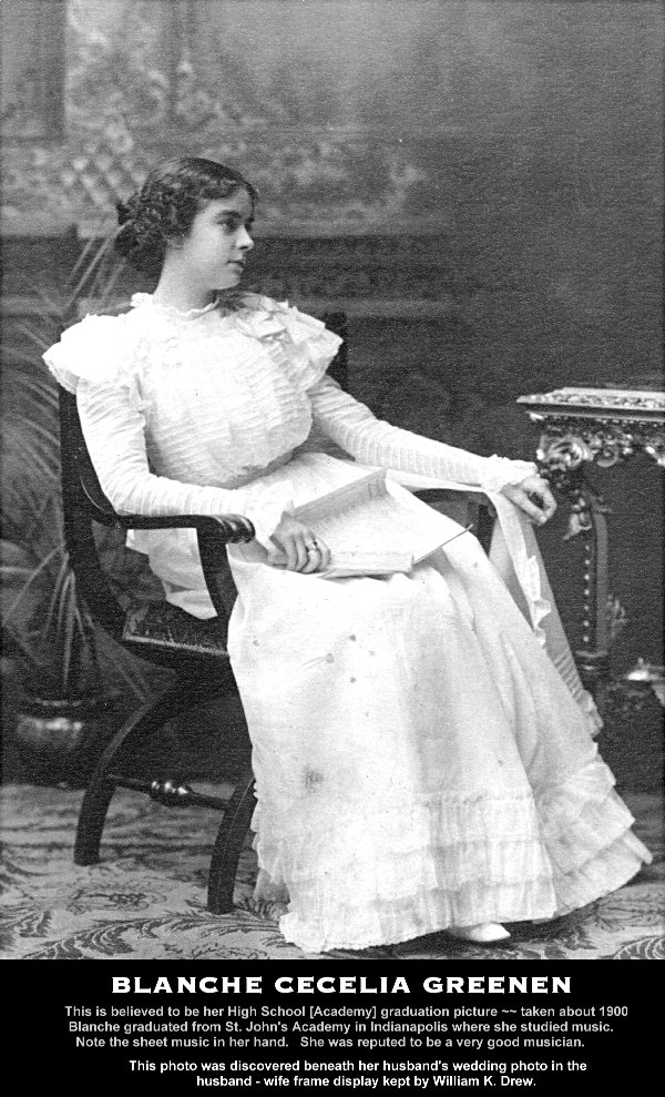 This picture is of Blanche Greenen Drew... probably at about age 16.  Note that she is wearing some kind of medal... assumedly the occasion for having her picture taken.  Most likely the medal was for an accomplishment in music which the focus of her curriculum while at St. John's Academy in Indianapolis...  a curiculum equivalent to "high school" ...but different!