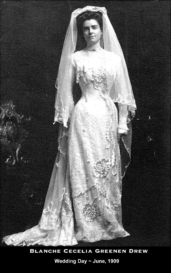 This is most definitely Blanche Greenen Drew's wedding picture.  Note that the dress is definitely different than that in the picture (in Greenen-1) where she is wearing the big hat.  Blanche and "Harry" Drew were married in June of 1909; so they were both age 29 when they were married.