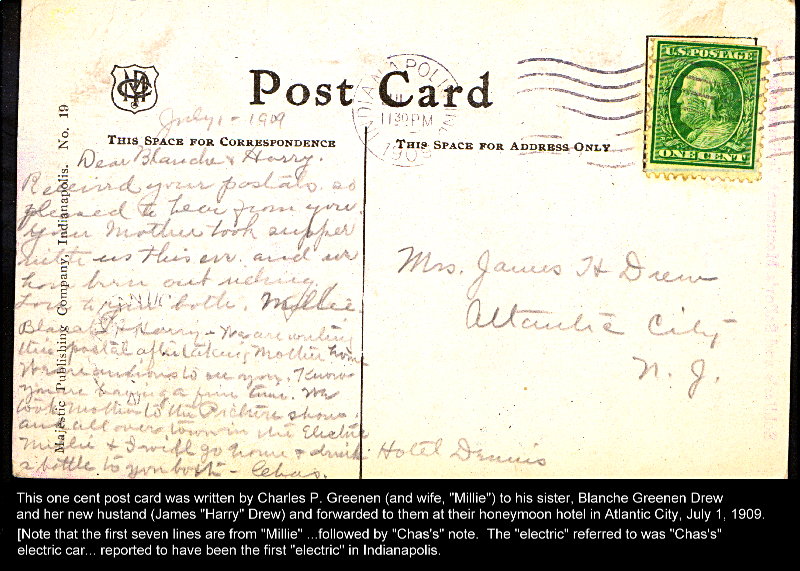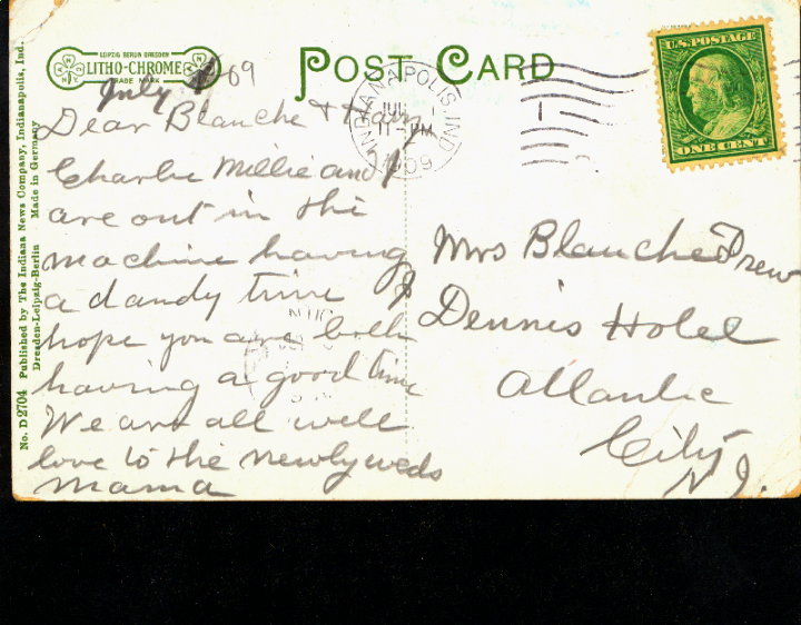 This post card was written by Sara "Katie" Ryan Greenen to her daughter Blanche Greenen Drew and her new husband James "Harry" Drew while Blanche and Harry were on their honeymoon.  Note that "Katie" does a good job of dotting i's... but gets failing grades in crossing t's.  The meaning of this is beyond the scope of genealogy, I am sure.  Some background that is between the lines of this postcard and the one above:  Contemporaries would have understood that taking "Katie" out for a "spin" and to the "movies" would have been a break from taking care of a wheelchair bound husband "J.W."  He was very much alive (until 1918) and lived to see many of his grandchildren... but from a wheelchair.  As to why he would not have joined his wife and son for dinner and a movie and a ride in the "machine" ...He was just NOT ABLE.