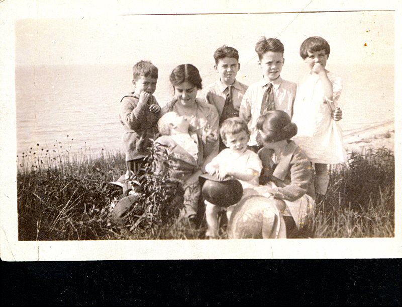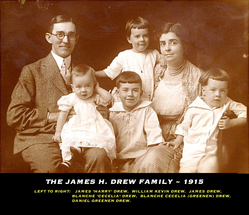 This is a photo of Blanche Greenen Drew and all 7 of her children.  The picture (probably 1922) was taken at Willoughby Beach... near Cleveland Ohio where the family lived from about 1918 till 1925.  The photo shows the Drew children (at back- left to right) William Kevin, Richard Francis. (in Blanche's arms,) James Joseph, Daniel Greenen, and Mary Louise.  Seated in Front is (Blanche) "Cecelia" holding Edward Vincent.