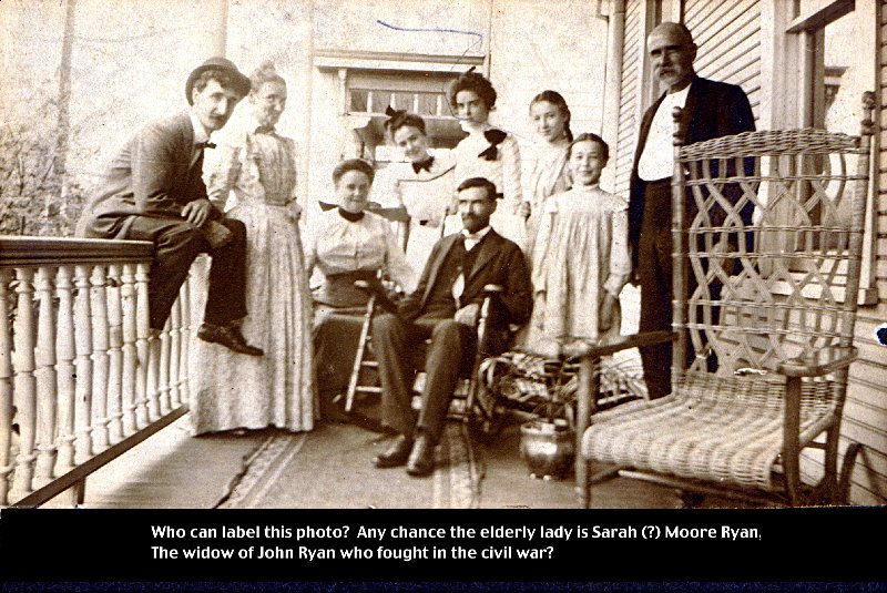 This photo is believed to be an 1898 photo and was taken at an occasion that involved Blanche Greenen and her cousin Ruby Krueger... both of whom appear to be dressed in some sort of "formal uniform" in the picture... probably an event at St. John's in Indianapolis, where they attended school.  The photo can best be analyzed by focusing on Katie Ryan Greenen, who is seated in the center of the photo of the photo beside her husband, Joseph W. Greenen who is seated in a rocking chair.  I believe the elderly lady at Katie's right is her mother, Sarah Moore Ryan.  The tall girl with her bow "askew" (standing above her father, J.W.) is Katie's daughter, Blanche.  After careful study, I believe the remainder of the people in the photo are the family of Katie's sister, Julia Krueger.  The stout balding gentleman would be Karl Krueger, and the rest of the young people would be his children, though we do NOT have documentation about the family of Julia Ryan and Karl Krueger as of August 2001.  Julia's absence from the photo is compatible with the history that she "ran off" and was not heard from again.
