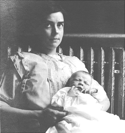 The original caption can still be seen on the uncropped version of this picture. [Not visible on the "cropped" photo above.]  It is My grandmother, Blanche Greenen Drew holding my father, Daniel Greenen Drew who is about two weeks old in the photo.