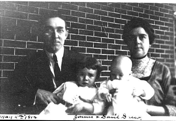 The original caption is easily seen on this photo also... It shows James H. ("Harry") Drew holding his eldest child, James Joseph... and Blanche Greenen Drew holding their second-born, Daniel Greenen Drew at age four months.