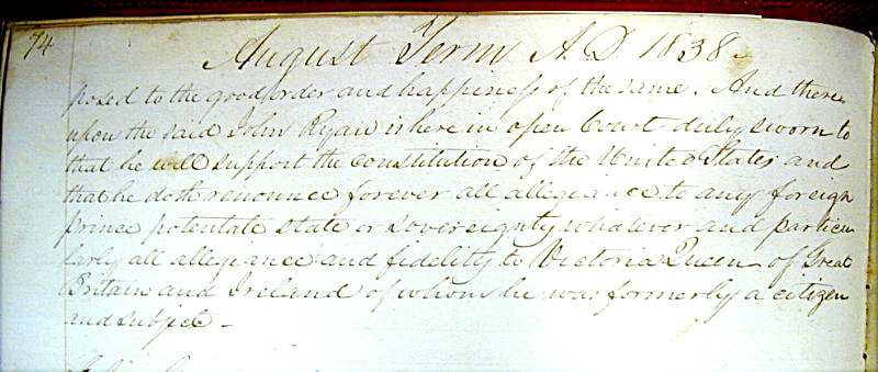 Click to enlargeThe court records do not indicate the exact date on which John Ryan was pronounced a citizen of the U.S. However, we know that he got married on August 21, 1838... and there is every reason to suspect that John (and Sarah) celebrated these two events as one gigantic "happening." It is quite possible that the citizenship ceremony and the marriage occurred on the same day.