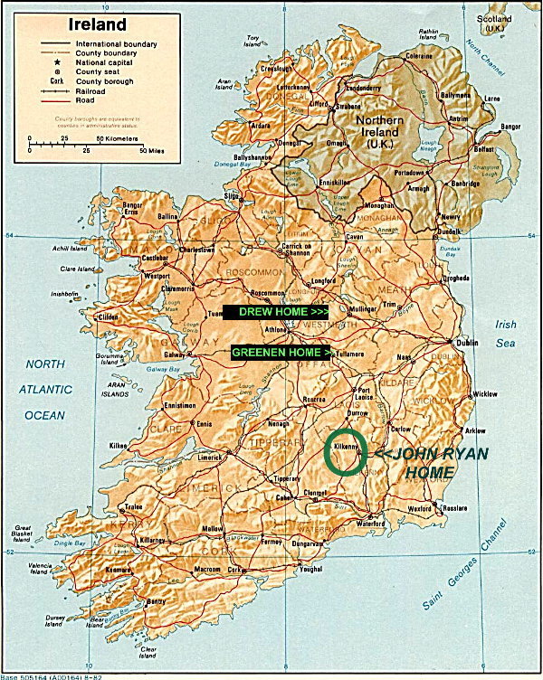 CLICK HERE or on the thumbnail at left to view a full resolution map of Ireland showing where the city of Kilkenny is located. Numerous photos from our trip to Kilkenny are in my files and our visit there in the year 2000 was most enjoyable even though we did not locate John Ryan's birthplace. CLICK HERE or on the thumnail at left to see a typical scene from County Kilkenny. This photo was chosen from among many because it is a "scene" that John Ryan himself could have witnessed... and because it shows the lovely terrain of the county very well.